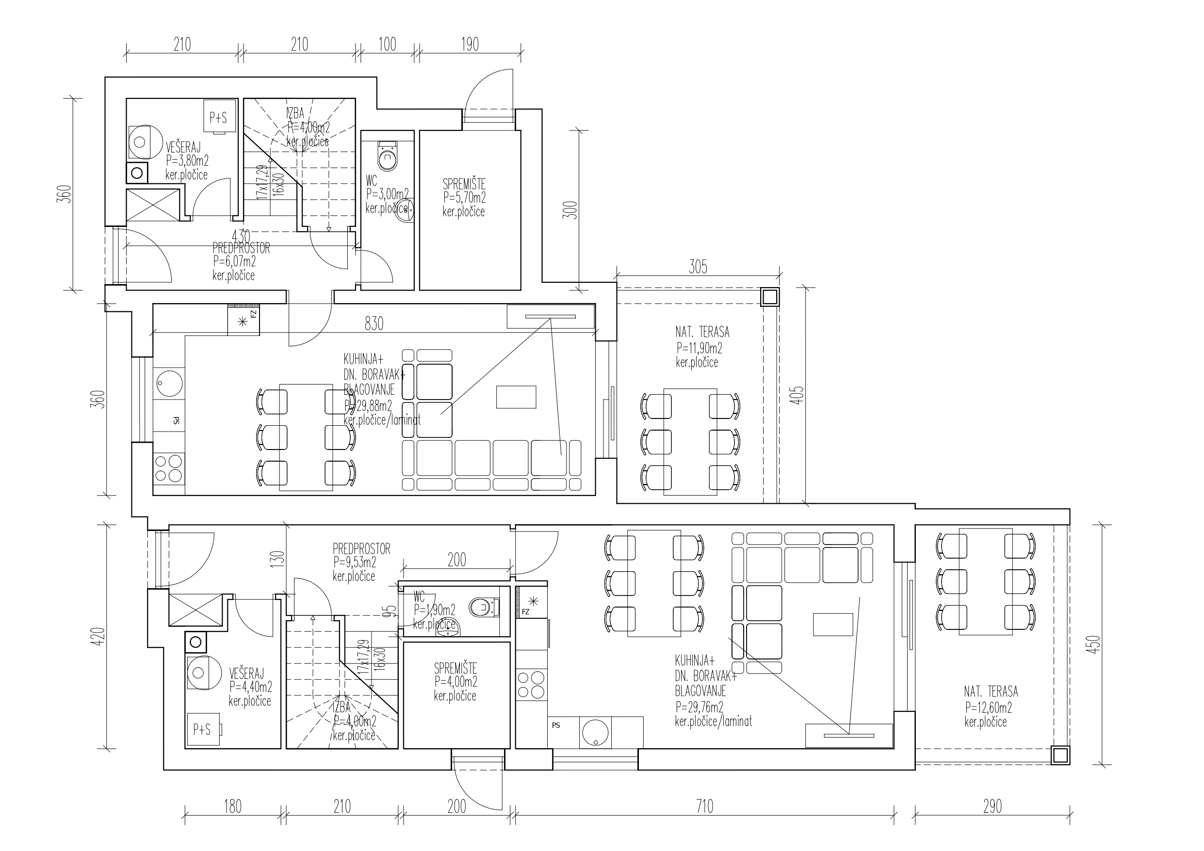 Konstrukcija: Nosivi zidovi debljine 25 cm, AB stupovi i grede, FERT strop, temeljenje na armirano-betonskim trakama i stopama